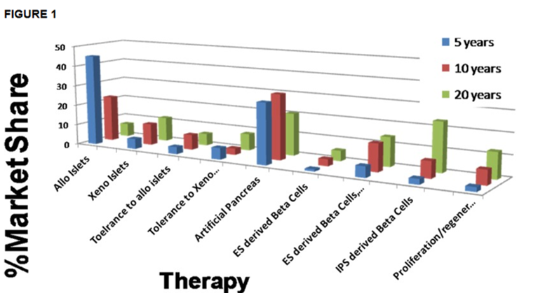 Imagen: Expected changes in β cell replacement over time. before the conclusion of the conference, a web based survey was completed by the participants seeking their individual opinion as to what portion of the β-cell replacement market would be captured by the existing and potential therapies discussed at the meeting. For each of the time horizons of 5, 10, and 20 years, respondents allocated predicted market share between 9 potential therapeutic options. The graph shows the average market share awarded to specific therapies at 5, 10, and 20 years.