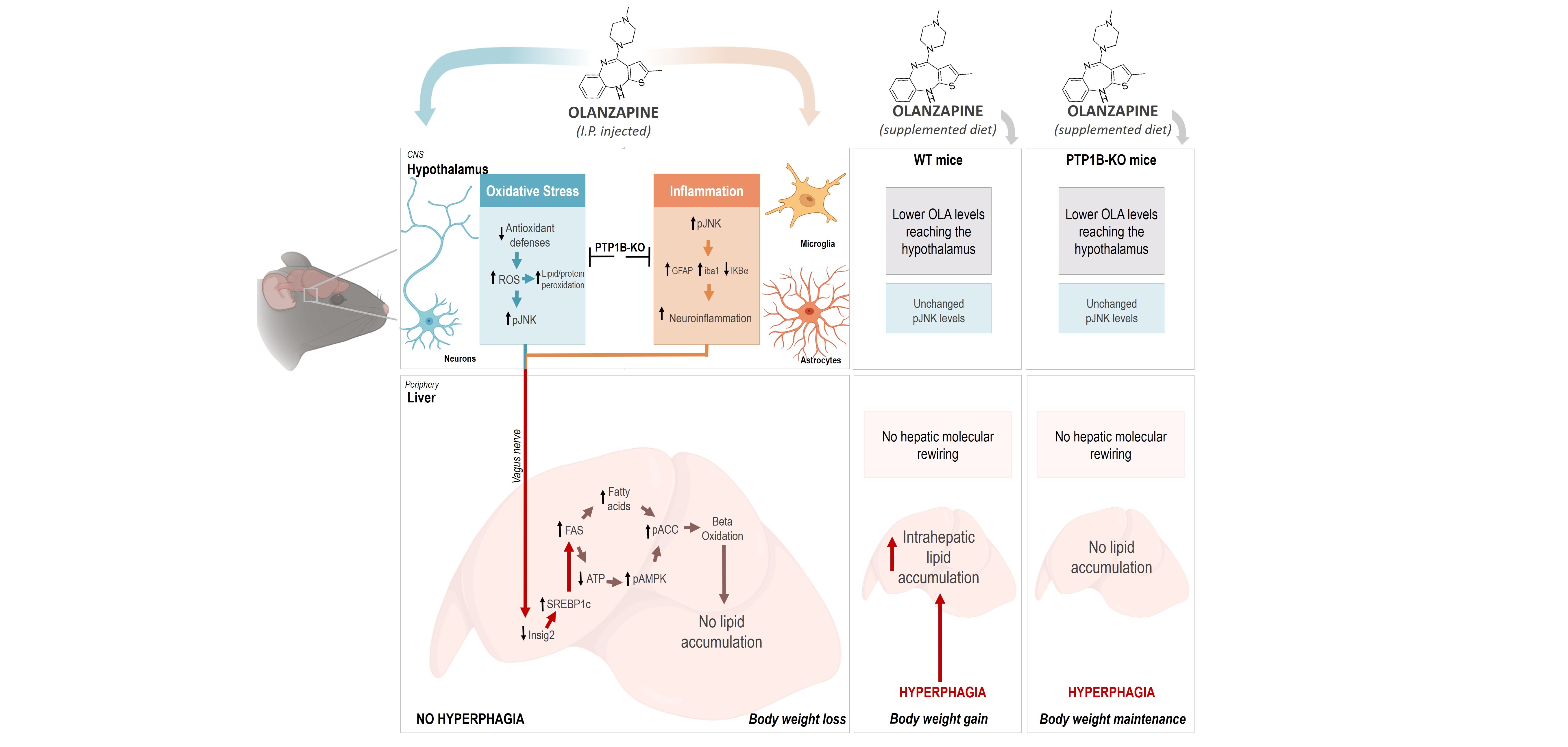 Por otra parte, se han explorado los efectos de la olanzapina en ratones deficientes en la proteína tirosina fosfatasa 1B (PTP1B), un modelo preclínico protegido frente a obesidad. Las autoras destacan el beneficio adicional de la inhibición de PTP1B frente al estrés oxidativo e inflamación inducidos en el hipotálamo por el tratamiento intraperitoneal con olanzapina, previniéndose así la reprogramación metabólica del hígado que conduce al aumento de FAS observado en los ratones de genotipo salvaje.
