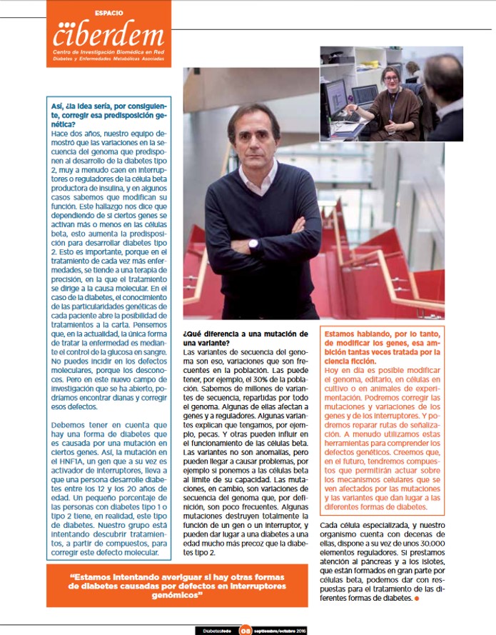 En una entrevista publicada en el último número de DiabetesFEDE, Jorge Ferrer, jefe de grupo del CIBERDEM, explica su trabajo de investigación con el foco puesto en las respuestas que la genómica puede aportarnos al abordar una enfermedad como la diabetes a la que ahora solo sabemos contener con prevención y con el control de la glucosa en sangre.