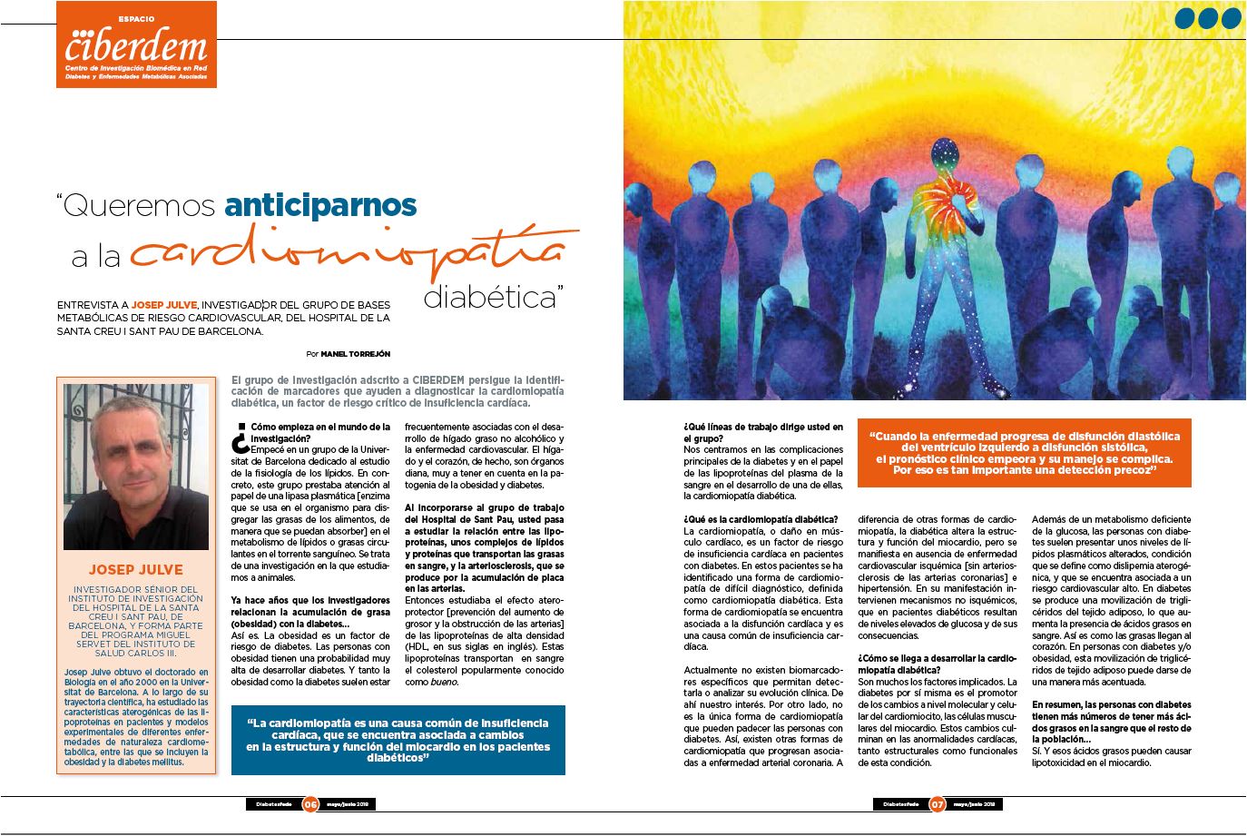 El último número de la revista DiabetesFEDE (mayo-junio 2018), dentro del espacio que dedica al CIBERDEM, recoge una entrevista al investigador del CIBERDEM Josep Julve, del grupo liderado por Francisco Blanco Vaca en Hospital Sant Pau de Barcelona.