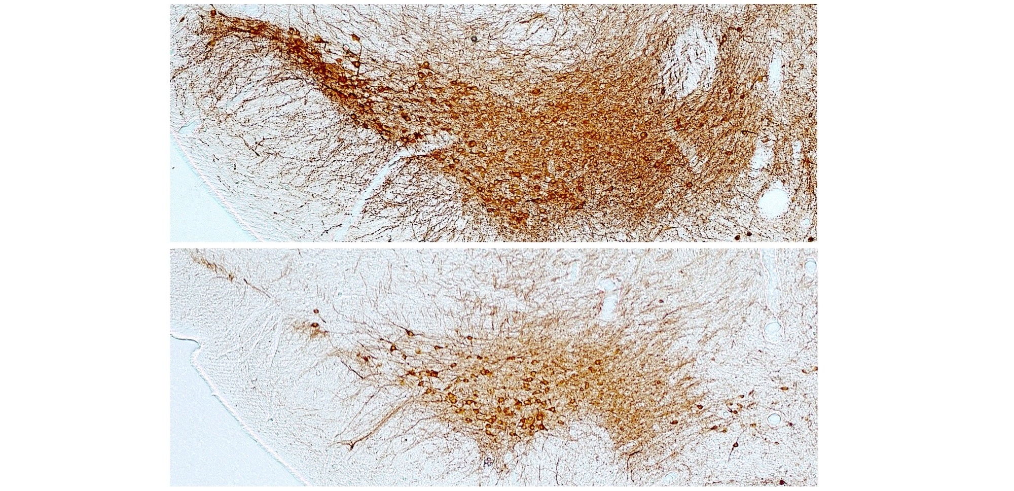 Neuronas dopaminérgicas de la sustancia negra del cerebro tras la administración de una dosis baja de la neurotoxina 6-hidroxidopamina. Arriba, ratón sano, abajo ratón diabético en el que se aprecia la pérdida de neuronas. / Mario Vallejo y Iara Pérez-Taboada