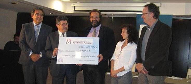 El Centro de Investigación Biomédica en Red de Enfermedades Respiratorias (CIBERES) ha recibido durante el sexto aniversario de la Fundación Contra la Hipertensión Pulmonar (FCHP) un cheque por valor de 34.000€ para el Proyecto Empathy dedicado a facilitar el diagnóstico precoz de la Hipertensión Arterial Pulmonar y el descubrimiento de nuevas vías de tratamiento que culminen con la curación de esta enfermedad, que ha conseguido importantes hitos durante este año. Uno de ellos ha sido su puesta en marcha por parte del CIBERES. El cheque fue recibido por Manuel Sánchez, gerente del CIBER y los doctores Francisco Vizcaino y Jesús Ruiz-Cabello, investigadores del CIBERES.