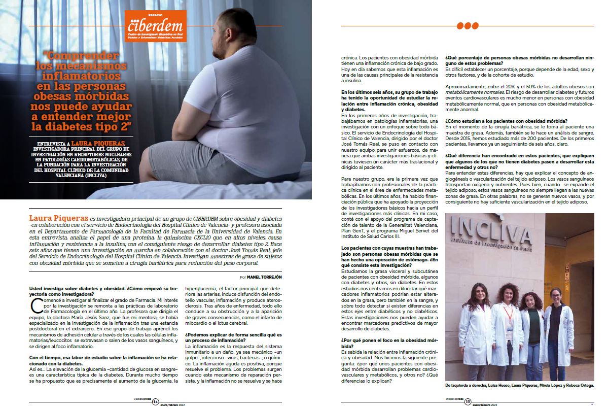 Así, el primer número de 2022 (enero-febrero) la revista destacó el trabajo de Laura Piqueras, investigadora principal del Grupo de Receptores Nucleares en Patologías Cardiometabólicas de la Fundación para la Investigación del Hospital Clínico de la Comunidad Valenciana (INCLIVA). La investigadora del CIBERDEM explicó a DiabetesFEDE el papel de la quimiocina CXCL10 que, en altos niveles, causa inflamación y resistencia a la insulina, con el consiguiente riesgo de desarrollar diabetes tipo 2.