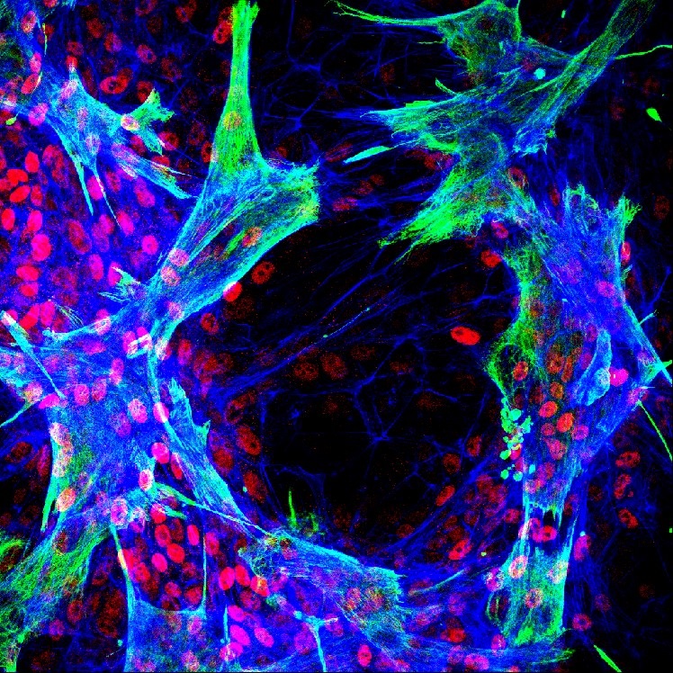 Imagen de inmunofluorescencia que muestra células estrelladas hepáticas primarias humanas que interactúan con células progenitoras hepáticas bipotentes in vitro. Los cultivos se marcaron utilizando anticuerpos contra vimentina (verde), HNF4a (rojo) y se trataron con faloidina (azul). El estudio mostró que la diferenciación de las células progenitoras se localizó en los sitios de contacto entre los dos tipos de células.